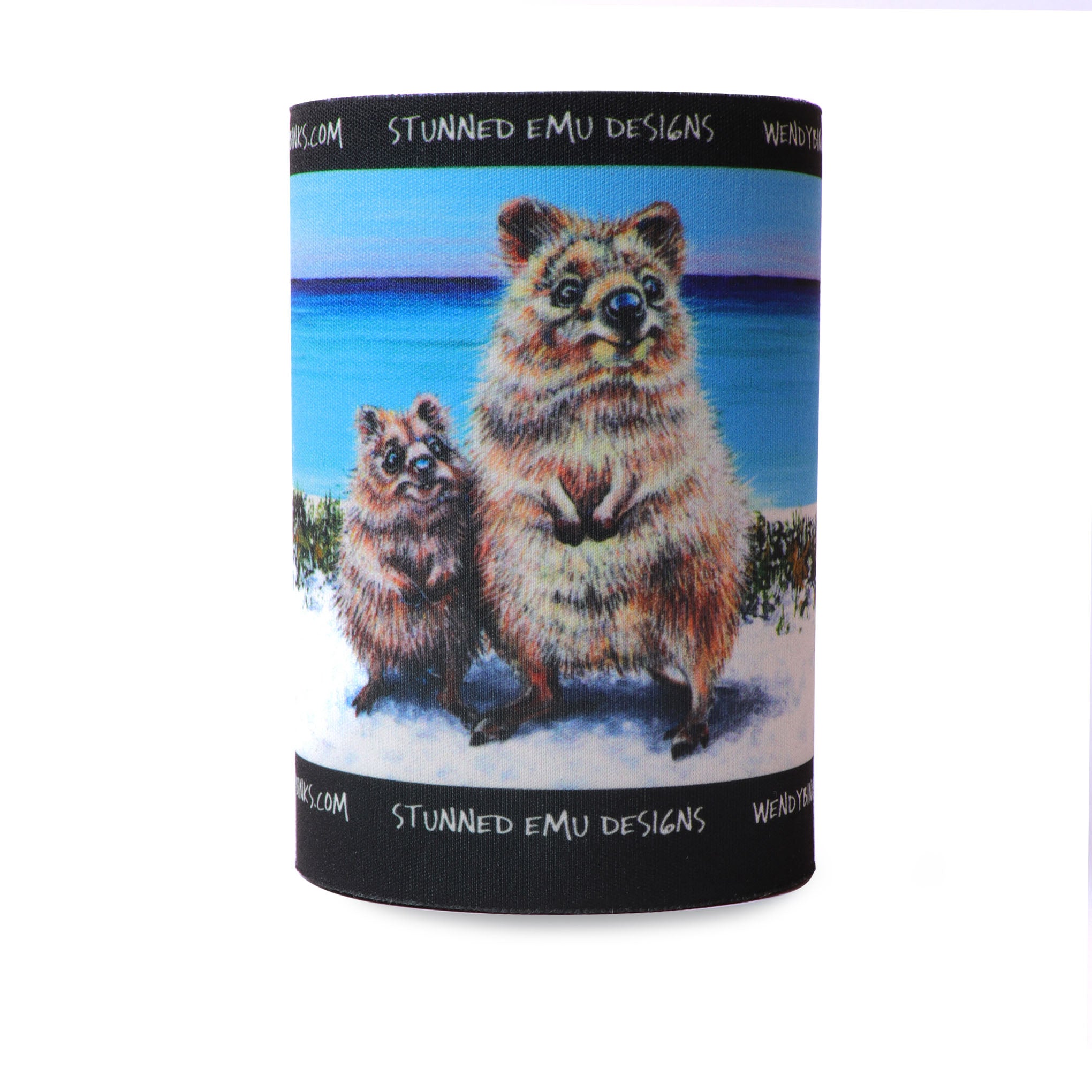 A quokka mum and her joey, painted by Wendy Binks with all the warmth and tenderness they deserve. Soft coastal tones, genuine heart, and that irresistible quokka charm that makes everyone smile without fail. Five millimetres of neoprene keep your drink cold while this one keeps things sunny.