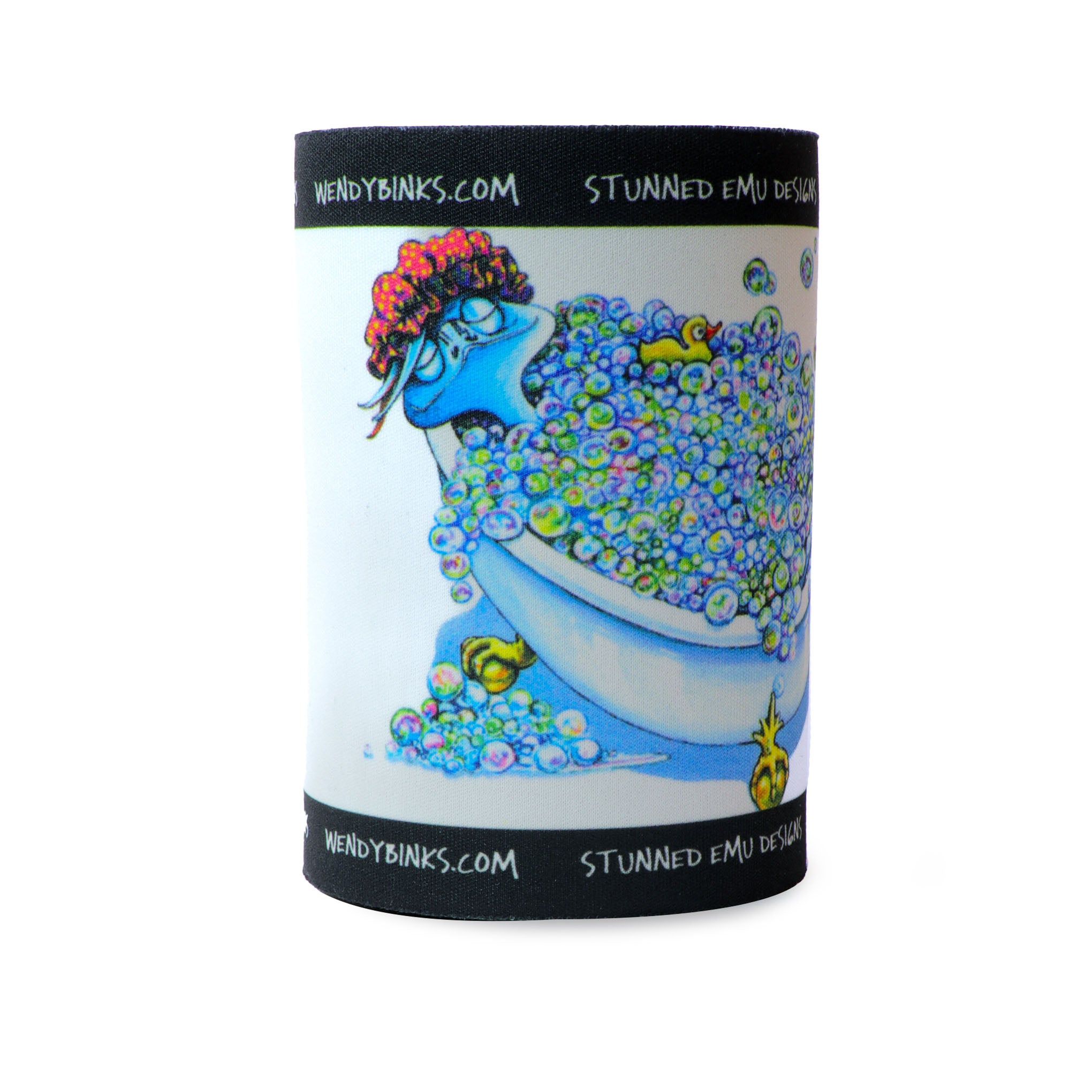 This emu is in the tub, surrounded by bubbles, and genuinely thriving. Wendy Binks has painted him with the kind of joy that's impossible not to catch – soft blues, playful composition, and an expression of absolute contentment. A 5mm neoprene stubby holder that makes people laugh out loud the first time they see it, and smile every time after that.