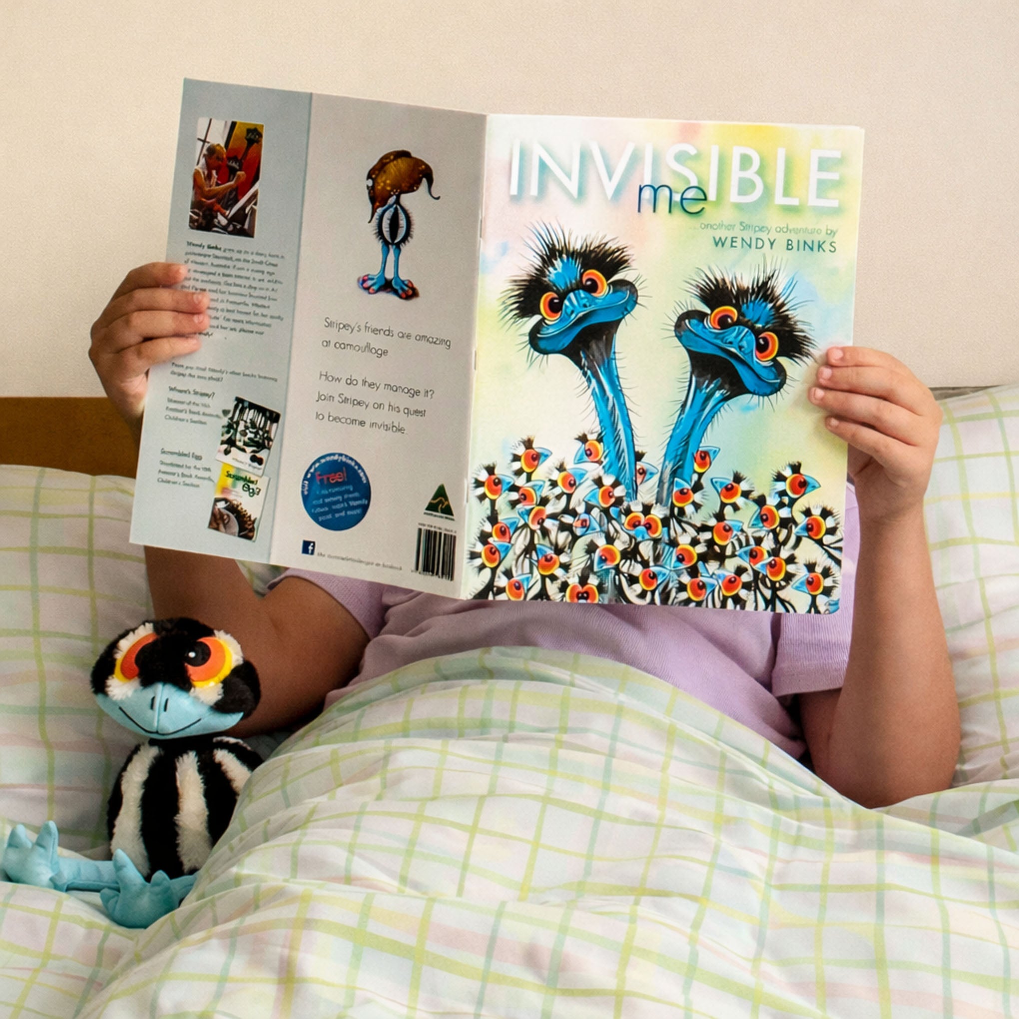 Invisible Me is a playful Australian picture book where Stripey sets out to master the art of camouflage. Curious and determined, he watches his friends disappear into scrubby greens and sandy browns, wide eyes working overtime. The illustrations are lively and layered with outback detail, inviting little readers to look twice and then look again. Bedtime suddenly becomes a game of hide-and-seek.
