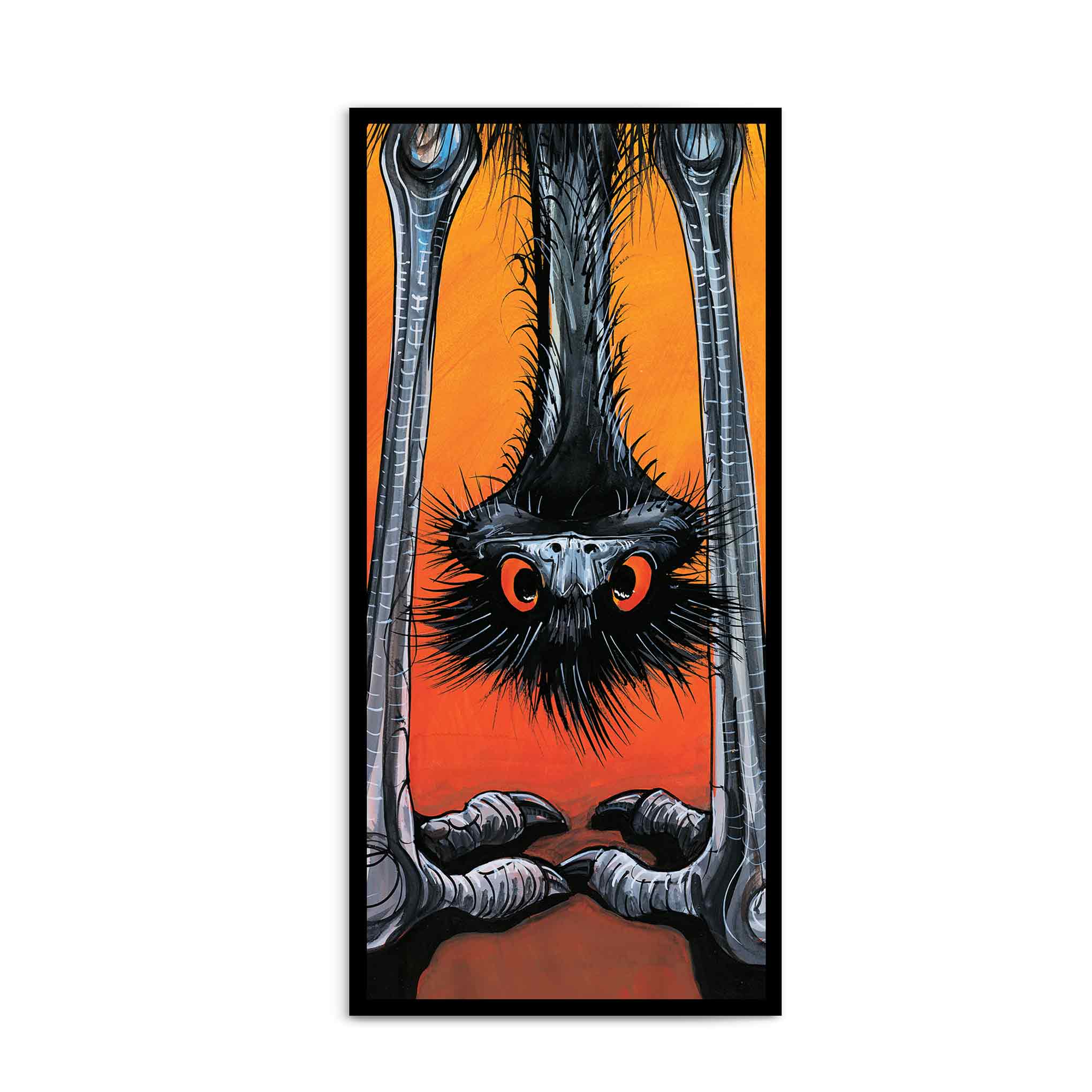 This emu has decided that upside down is a perfectly reasonable way to see the world – and honestly, it's hard to argue. Bold, graphic, and full of Wendy Binks' signature cheeky energy. A postcard that makes people look twice, then grin, then immediately want to know where it came from.