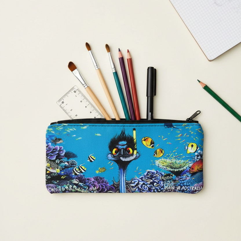 Nobody asked him to. Nobody told him he couldn't. And honestly, looking at him down there amongst the coral and the tropical fish, mask on and absolutely committed to the experience – you have to respect it. Wendy Binks' snorkelling emu is one of her most joyful designs, and it wraps around a durable wetsuit-style pencil case that's built for adventure. Fittingly.