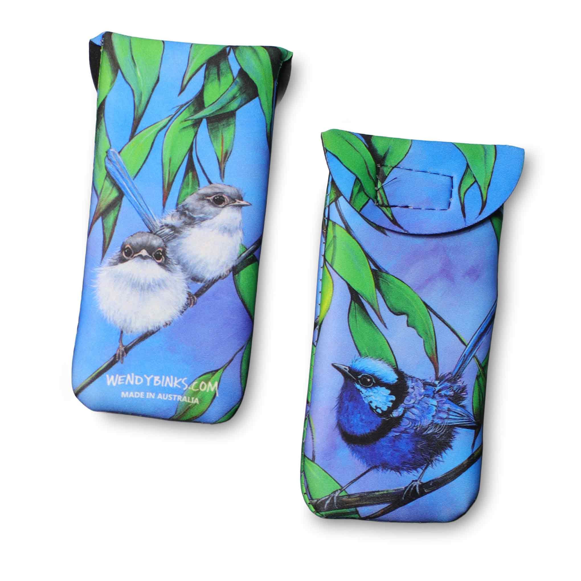 Splendid Wrens gathers a little chorus line of charm along a bending branch. Try not to smile. The defining trait here is togetherness, five small bodies tucked close while one brilliant blue male hovers nearby like the show-off cousin. Looking at it feels gentle and grounding, like catching a quiet moment just before the day properly begins. Inky navy and cobalt feathers glow against soft grey chests, framed by sweeping eucalyptus leaves in layered greens over a cool twilight sky. Slim branches arc across the scene, giving the whole piece a calm, natural rhythm. Small birds, big presence.